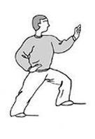 上體左轉,左腳向左前方上一步,腳跟輕著地,重心仍在右腿,兩腳保持約20厘米距離。