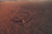 金字塔[“東方金字塔”西夏王陵]陵區北部偏東,有一座規模較大的陵邑性質的建築遺址。遺址內廣場、道路、院落、水井和房屋等遺蹟都清晰可見,布局十分規範整齊,總面積近10萬平方米。四周築有夯土城牆。城內分前、中、後三個部分,中部和後部的正中各有一座規模宏大的殿堂,其他建築多集中在城的前部和中部,並組成一座座封閉式庭院。遺址中發掘出大批色澤鮮艷的綠色琉璃板瓦、筒瓦、瓦當、滴水、脊獸、鴟吻和其他建築裝飾構件,如乳白色或青白色帶有冰裂紋的小白瓷板瓦、側邊有黑色釉的牛郎合瓦、精雕細琢的石刻。