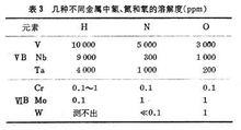 金屬中氣體氣體在過渡族金屬中的溶解度隨其電子結構而不同,ⅤB族金屬(V、Nb、Ta)中的氫、氮和氧的溶解度便較高,而ⅥB族金屬(Cr、Mo、W)則甚低,如表3。 這些填隙原子在金屬中的含量超過溶解度時,就會使金屬變脆。通過純化來提高韌性,對 V、Nb、Ta來說,比較容易做到,而對Cr、Mo和W來說就很難。這三種金屬在冶煉和加工工藝上的困難,也與此有關。
