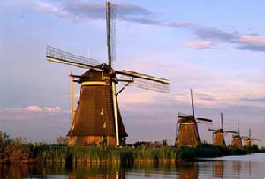 眾所周知,荷蘭的風車是世界聞名的。即使在今天,荷蘭的風車還有一千多個。在世界範圍內,沒有任何一個其他地方比荷蘭的一個村鎮--金德代克的風車還要多。公元1740年左右,至少有十九個堅固的風車就建設在金德代克村鎮那兒。值得慶幸的是,這些風車保存到今天,依然完好無缺。荷蘭這些巨大風車的作用主要是將風力轉化為槳輪的轉動。從物理上講,就是將風能轉化為動能,從而將低處的水提上來。如今,這個提水工作已經由動力驅動的抽水機代替。在荷蘭這么多的抽水站中,其中有一個是全歐洲最大的抽水站。荷蘭人圍海造成了阿爾布拉瑟丹低田(它們的海拔高度是低于海平面的),而這些風車的作用則是將阿爾布拉瑟丹低田中多餘的水抽出來,然後排泄到附近的河流湖泊中。從公元1927年起,柴油機的抽水站就做了實際上的抽水工作。風車就不再被人們使用了。不過,在第二次世界大戰中,由於當時的柴油機缺乏燃料而不能驅動抽水機,因此,風車又一次得到使用,這也是人們最後一次使用風車進行抽水工作。