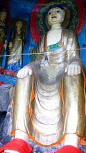 金華山大佛穿過楠竹海,便是大佛殿,殿堂雖然不算大氣,但香菸繚繚。再攀上一段陡峭岩壁,就可見金華山大佛了。依山臨岩鑿成的大佛,端坐蓮台,寶相莊嚴,造型有點像樂山大佛。大佛右邊有天宮寺,據說,自中唐以後,天宮寺就香火鼎盛。