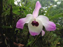 金釵石斛[微子目蘭科植物]總狀花序從具葉或落了葉的老莖中部以上部分發出,長2~4厘米,具1~4朵花;花序柄長5~15毫米,基部被數枚筒狀鞘;花苞片膜質,卵狀披針形,長6~13毫米,先端漸尖;花梗和子房淡紫色,長3~6毫米;花大,白色帶淡紫色先端,有時全體淡紫紅色或除唇盤上具1個紫紅色斑塊外,其餘均為白色;中萼片長圓形,長 2.5~3.5厘米,寬1~1.4厘米,先端鈍,具5條脈;側萼片相似於中萼片,先端銳尖,基部歪斜,具5條脈;萼囊圓錐形,長6毫米;花瓣多少斜寬卵形,長2.5~3.5厘米,寬1.8~2.5厘米,先端鈍,基部具短爪,全緣,具3條主脈和許多支脈;唇瓣寬卵形,長2.5~3.5厘米,寬2.2~3.2厘米,先端鈍,基部兩側具紫紅色條紋並且收狹為短爪,中部以下兩側圍抱蕊柱,邊緣具短的睫毛,兩面密布短絨毛,唇盤中央具1個紫紅色大斑塊;蕊柱綠色,長5毫米,基部稍擴大,具綠色的蕊柱足;藥帽紫紅色,圓錐形,密布細乳突,前端邊緣具不整齊的尖齒。花期為4~5月。