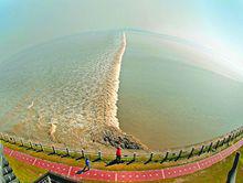 錢塘江一線潮看過大缺口的交叉潮之後,建議您趕快驅車到鹽官,等待觀看一線潮。未見潮影,先聞潮聲。耳邊傳來轟隆隆的巨響,江面仍是風平浪靜。響聲越來越大,猶如擂起萬面戰鼓,震耳欲聾。遠處,霧蒙蒙的江面出現一條白線,迅速西移,猶如“素練橫江,漫漫平沙起白虹”。再近,白線變成了一堵水牆,逐漸升高,“欲識潮頭高几許,越山橫在浪花中”。隨著一堵白牆的迅速向前推移,涌潮來到眼前,有萬馬奔騰之勢,雷霆萬鈞之力,勢不可擋。