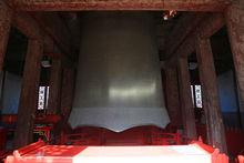 46.5噸的巨大重量是通過正反兩個U型銅卡互相銜接交付給木質大梁來承擔的。那根鎖定兩個銅卡的銷釘何等纖細小巧,只有6.6公分寬,14.3公分高,科學家發現古代設計者為了既提高強度,又保持懸掛部位外觀的色澤一致,在銷釘中也橫穿了一根鋼芯。或者說,這是一根外面包了青銅的鋼釘。根據所受剪應力計算,其安全係數為8.2,遠遠超過了當代飛機上材料強度的安全係數。有人還進一步作出動態計算,銷釘可承受的鐘體擺動速度為每秒15.4米。即使將大鐘倒豎著舉起,再任其自由落下做加速運動,也不會將銷釘掙斷。至於堅實的木樑和微微內傾的支柱,更是經過幾百年多次強烈地震的嚴酷考驗而紋絲不動。古人竟創造了這樣簡單廉價又萬無一失的支撐系統。