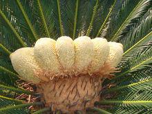 鐵樹花[蘇鐵科植物蘇鐵的花]雄球花卵狀圓柱形或長圓形,長達30cm,徑6-8m;小孢子葉楔形,