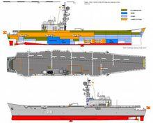 美國海軍制海艦概念圖由於迷宮號已經相當老舊,西班牙海軍在1970年代便開始自行設計一種以反潛為主要任務的輕型短距起降航空母艦,搭載AV-8與反潛直升機。這艘新航空母艦的設計乃參照美國Gibbs & Cox公司在1970年代為美國海軍設計的 制海艦,並依照西班牙的需求進行諸多修改。本艦最初打算命名為卡瑞歐·布蘭卡提督號(Almmirante Carrero Blanco),稍後則改為阿斯圖里亞斯親王號(Principe de Asturias R-11) 。本艦於1977年6月開工,1979年10月安放龍骨,1982年5月22日下水水,1988年5月30日進入西班牙海軍服役,而迷宮號也得以在1989年8月功成身退。阿斯圖里亞斯親王號之所以工期拖得這么長,主要是因為歷經多次設計變更而是進度延後,包括參考英國無敵級航空母艦的設計。
