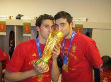 台北時間2012年7月2日,歐洲杯決賽西班牙戰勝義大利奪冠,賽後球員們與家人慶祝奪冠。圖為阿貝羅亞與妻子擁吻。