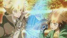 | 大空彭格列匣 大空彭格列匣的動物形態是大空雄獅,名為“納茲”,外表與XANXUS的“Bester”在細微部分上有些微的差異。 可轉換防禦模式成“染盡一切,吞噬一切,包容一切的天空──初代的披風”,能把對方的攻擊與周遭景物調和可轉換攻擊模式“初代的防護手套”,絕招“宇宙超炸裂”以及“燃燒加速”(彭格列指環原版覺醒後),是將全身的死氣之火集中於拳頭,再釋放出終極一擊的拳擊,威力號稱與X BURNER同等。 | 納茲與阿綱 |