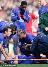曼聯全隊鼓勵史密斯2005年夏天,弗格森決定讓史密斯改打後腰,寄希望他能成為曼聯傳奇後腰羅伊·基恩的接班人。弗格森認為史密斯擁有和基恩一樣的頑強精神,而羅伊·基恩也表示他在史密斯身上看到了年輕時的自己。於是史密斯位置後撤擔任後腰,尤其是在基恩長期傷停的情況下史密斯成為了曼聯的主力後腰。但是史密斯的後腰改造並不順利,儘管他和基恩一樣頑強敬業,但是卻被認為是勇猛有餘、細膩不足,防守儘管兇狠但是缺少基恩的組織傳球才能,並不能像基恩那樣用精準的傳球掌握球隊節奏。進入2005年10月份,曼聯成績每況愈下,基恩在MUTV的採訪中公開指責年輕球員不成器,其中史密斯、弗萊徹等人被認為是基恩的攻擊對象,史密斯也決心用表現回擊基恩。在2005年11月6日曼聯對陣切爾西的比賽中,史密斯表現出色幫助曼聯1:0擊敗此前勢如破竹的切爾西,而三天后基恩就被解除契約,史密斯鞏固了自己在曼聯的主力位置。但是因此他的轉型卻使得他在國家隊位置卻受到了影響,因為英格蘭國家隊並不缺少後腰。2006年02月18日,阿蘭·史密斯在客場對陣利物浦的足總杯比賽中挺身阻擋里瑟的大力射門時,被裡瑟射出的皮球打中支撐腳,小腿骨折而且腳踝脫臼。當時的場面觸目驚心,連利物浦的隊醫跑上場都上去幫助救治史密斯,在史密斯被隊醫抬下場的時候,他受到了整個安菲爾德球場主隊球迷送給他的鼓勵的掌聲。他的手術很成功,但是此次重傷使得他將缺席很長一段時間,而他自然也失去了在2006年世界盃為英格蘭上陣的機會。2006年2月底,當曼聯在聯賽杯決賽以4:0擊敗維甘競技後,全體曼聯球員穿上印有“For you Smudge(史密斯的綽號)”的白色T裇上台領獎,以此來鼓勵史密斯能早日康復。