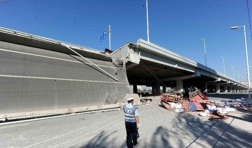 2012-8-24哈爾濱大橋坍塌現場事故性質:事故調查組經過取證,根據專家分析意見與國家建築工程質量監督檢驗中心結論,認定此事故是由於車輛嚴重超載而導致的匝道傾覆,車輛 翻落地面,造成人員傷亡的特大道路交通事故。