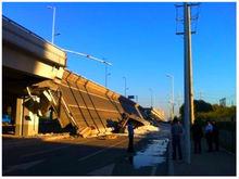 陽明灘大橋引橋坍塌2012年8月24日5時30分左右,哈爾濱陽明灘大橋引橋——三環路群力高架橋洪湖路上橋分離式匝道發生斷裂,坍塌大梁長為130米左右,屬於整體垮塌。致使4輛大貨車墜橋,側翻的部分大貨車駕駛室已完全被砸扁,帶血跡的方向盤等物飛出落地。據消防部門訊息,事故當日已造成3人死亡、5人受傷。