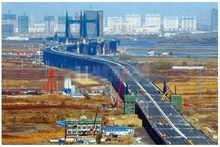 陽明灘大橋通車儀式陽明灘大橋位於哈爾濱市西部松花江幹流上,因主橋穿越松花江陽明灘島而得名,工程於2009年12月5日開工建設,2011年11月6日建成通車,估算總投資18.82億元。為哈爾濱市首座懸索橋(雙塔自錨式懸索橋),全長7133米,其中橋樑部分長6464米,接線道路長669米,每小時車流量可達9800輛,橋面寬度41.5米,雙向8車道,主橋跨度427米,主塔高80米,橋下通航淨高不小於10米,可滿足松花江三級航道通航要求。