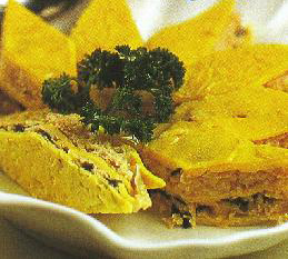 5. 將雞蛋皮鋪在盤子上,先鋪上銀耳餡,再鋪上木耳餡做成兩中顏色的厚餅,上蒸鍋蒸5分鐘取出,改成菱形塊,擺在盤中即可。