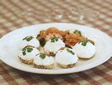 2.將雞蛋清打成發蛋,分成 12份,放在抹上熟豬油 25克的盤中,抹平。用火腿末、香菜葉在發蛋面上擺成花朵形,上籠用小火蒸熟,分裝在蟹粉面上。將鍋置中火上,舀入雞清湯 150克,加味素燒沸,用水澱粉 10克勾芡,加熟豬油 40克攪勻,淋在發蛋上即成。