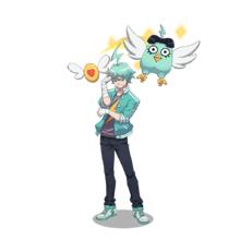 穿著青色棒球衣,裡面穿著印有閃電的黑色襯衫,右手纏滿繃帶(自稱是為了封印雷電之力),頭上頂著閃電的青色頭髮。寵物雷雷鳥通體青色,有白色的翅膀,黃色的爪子,黑色的頭髮。