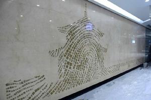 青島站3號線文化牆《紋脈》青島捷運3號線青島站有中央美術學院四副銅鑲嵌作品。作品創造性地使用了指紋印記的造型元素,將青島方言文字化呈現,並組合成青島老建築、船等剪影式的造型。體現了青島獨特的地緣性及歷史融合性,沉穩而有底蘊。巧用石材銅鑲嵌工藝將青島百年文化表現得淋漓盡致。