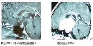 有時囊腫可較大,囊內密度或信號在CT及MRI為相似於CSF,囊壁薄,注藥後可輕度或無強化,囊腫體積較大時可導致幕上腦積水。鞍上生殖細胞瘤