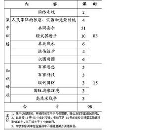 高級中學學生軍訓包括集中軍事訓練和軍事知識講座兩部分,時間為7至14天。課時分配見下表。