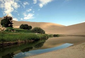 鳴沙山─月牙泉風景名勝區一彎清泉,漣漪縈迴,碧如翡翠。泉在流沙中,乾旱不枯竭,風吹沙不落,蔚為奇觀。歷代文人學士對這一獨特的山泉地貌,沙漠奇觀稱讚不已。