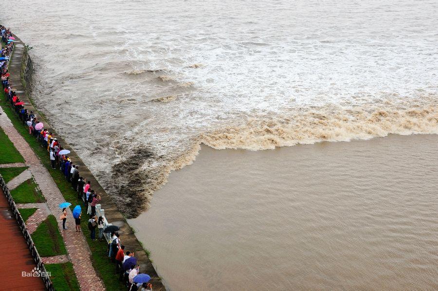 雄偉壯觀的錢江潮成因除月、日引力影響外,還跟錢塘江口狀似喇叭形有關。錢塘江南岸赭山以東近50萬畝圍墾大地象半島似地擋住江口,使錢塘江赭山至外十二工段酷似肚大口小的瓶子,潮水易進難退,到外十二工段僅寬幾公里,江口東段河床又突然上升,灘高水淺,當大量潮水從錢塘江口湧進來時,由於江面迅速縮小,使潮水來不及均勻上升,就只好後浪推前浪,前浪跑不快,後浪追上,層層相疊。其次還跟錢塘江水下多沉沙有關,這些沉沙對潮流起阻擋和磨擦作用,使潮水前坡變陡,速度減緩,從而形成後浪趕前浪,一浪疊一浪,一浪高一浪涌潮。