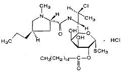 化學名稱:6-(1-甲基-反-4-丙基-L-2-吡咯烷甲醯胺基)-1-硫代-7(S)-氯-6,7,8,三脫氧-L-蘇式-α-D-半乳辛吡喃糖苷-2-棕櫚酸酯鹽酸鹽。
