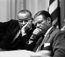 羅伯特·麥克納馬拉(右)越南戰爭的結束,並沒有終結美國人因越戰而引起的夢魘。這場戰爭不但使美國在國際上大失顏面,犧牲了五六萬寶貴的生命(美國人總認為他們的生命最寶貴),還造成了許多長期的社會心理問題。