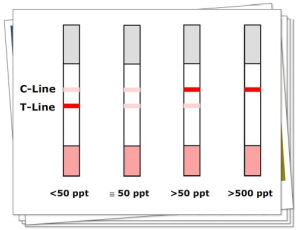T線不顯示,只有C線:樣品中的黃麴黴M1濃度等於或高於500ppt。