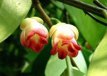 花單生於葉腋,稀成對, 雌雄同株; 雄花:花被片紅色,10-16片,中輪最大1片橢圓形,長2-2.5厘米,寬約14毫米,最內輪3片明顯增厚,肉質;花托長圓錐形,長7-10毫米,頂端具1-20條分枝的鑽狀附屬體;雄蕊群橢圓體形或近球形,徑6-7毫米,具雄蕊14-48枚;花絲頂端為兩藥室包圍著;花梗長1-4厘米, 雌花:花被片與雄花相似,花柱短鑽狀,頂端無盾狀柱頭冠,心皮長圓體形,50-80枚,花梗長5-10毫米。