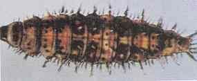 鼎點金剛鑽成蟲體長6-8㎜,前翅大部黃綠色,翅中央有三個鼎足排列的黃褐斑點。幼蟲體長10-18MM,胸腹各節有橫列刺六個。棉花害蟲。初孵幼蟲為害棉花嫩頭和嫩葉,嫩頭受害後叢生側枝。幼蟲稍大即蛀食蕾、花。蕾的中部有蛀孔,蛀孔圓形,大小3mm,蕾內無蟲糞,蕾外孔四周堆集著細小黑色糞粒,蕾內花蕊被蛀空,蕾苞葉張開變黑褐色脫落。為害鈴時,在鈴的基部有圓整的蛀孔,孔徑2.5mm左右,孔外堆集著黑色細顆粒狀糞便,鈴內纖維及棉籽受害而涸結乾燥,小鈴脫落,大鈴一部分被蛀不脫落,但易引致爛鈴或形成僵瓣。防治法:噴灑西維因等藥劑。