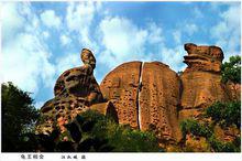 龜峰奇景——夕陽西下獅子峰狀如獅,形態變幻。從正面看,獅坐地上,形體高大,毛絨絨豎起,張開血盆大口,巨牙歷歷可數;從背面看,又似兇猛的回頭獅子,耳、葬、嘴稜線分明,臀肥、背寬,神態威武,昂首長吼。遊人不管從那個方向看,獅首總是隨著遊人目光轉動。相傳此獅是東海龍宮鎮守宮門的獅大將,名吼振,在與楊二郎激戰時,殉職疆場,雖死威不倒,仍然扼守宮門。獅身化為巨峰,一片丹心留人間。