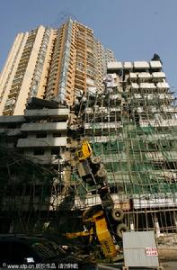 中午12時20分許,大樓突然發出“轟”的一聲,腳手架再也無法承受混凝土塊的重量,混凝土塊衝破腳手架,轟然墜下。吊車吊臂受到拉拽後緩緩傾斜,往人行道上倒去,吊車車身隨之“站立”在街面,油箱裡的大量柴油傾瀉到路面。