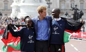 哈里和威爾遜·基普桑(右)瑪麗·凱塔尼倫敦國際馬拉松賽因距倫敦奧運會只有3個多月,因此許多國家都把這次比賽視為熟悉比賽線路、練兵和檢驗訓練成果的重要比賽,其中肯亞還將其作為奧運會選拔賽之一,因此匯聚了大批肯亞優秀選手,賽前奪冠的呼聲最高。比如參加女子比賽的不僅有去年冠軍凱塔尼,還有以2小時19分34秒獲得今年阿聯杜拜國際馬拉松賽亞軍的卡布,去年以2小時19分44秒問鼎德國柏林國際馬拉松賽的弗基普拉加特,以及去年以2小時20分46秒獲得倫敦馬拉松賽亞軍、韓國大邱世錦賽冠軍及前紐約馬拉松賽冠軍得主恩基普拉加特和韓國大邱世錦賽亞軍基普托等。