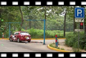 共設定三個限寬門,三門之間各相距3倍車長,1、3兩門設定於正對位置,2門與1、3門偏移一個門寬位置。要求機動車駕駛人駕駛車輛以不低於20公里/小時的速度,從三門之間穿越,不得碰擦懸桿。
