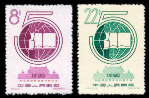 為祝賀“國際學聯第五屆代表大會”的召開,國家郵電部發行了這套紀念郵票。2幅畫面圖案相同。郵票下方繪有淡淡的天安門剪影,並有“1958”及上部的阿拉伯數字“5”字樣,表明了會議召開的時間、地點及屆數。
