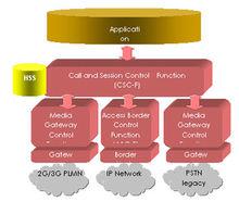一個IMS包括一個或多個CSCF、媒體網關控制功能(MGCF)、IMS媒體網關、多媒體資源功能處理器(MRFC)、訂閱位置功能、中斷網關控制功能(BGCF)和套用伺服器。我們下面解釋IMS如何實現其主要功能和如何為UMTS增加支持多媒體業務。