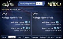 kew對比2006年與2011年人口普查的數據,5年來Kew經歷著一個黃金時段,個人收入方面,從2006年的579澳元每周上升到2011年的841澳元每周,升幅達到45.3%;而家庭收入方面,從2006年的1,720澳元每周上升到2,577澳元每周,升幅達到49.8%,升幅遠遠的拋離了全國平均水平的個人收入577澳元每周以及家庭收入1,481澳元每周。而區域內的公寓別墅比進一步降低,從2006年的75:25,降低到2011年的67:33.