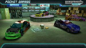 《極品飛車:地下狂飆》的袖珍車庫(Pocket Garage)中,也加入了 PSP 版專屬的互動式車庫,讓玩家一次收集遊戲裡的 20 款車輛。車庫中有“展示 & 炫耀”、“調校車輛”、“賽事準備”、“打造引擎”和“集體停車場”等五個區域;所有的升級都可透過袖珍車庫完成,玩家也可以使用“環繞模式”(Orbit Mode)向朋友展現調校後的成果。