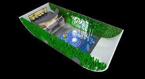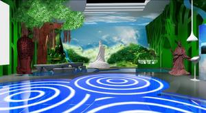 第二展區效果圖第二展區為互動區。 展區中有三個直徑兩米的大圓球,分別用福建特色的脫胎漆器、德化白瓷和漆線雕工藝製作。每個球上面都有一組經藝術家創作的精巧圖案,分別展現我省參博主題的三條主線“開放前沿”、“緣通兩岸”與“和諧家園”的相關內容。互動區背面展館牆上是一面近30平米的大型高清LED播放屏,通過大螢幕播放宣傳影片可以更加深動、全面地介紹海西發展的成就、理念與美好的前景,從而彌補展示空間的不足。螢幕兩邊是兩個超大的脫胎漆瓶,由福州脫胎漆器行業協會於2004年開始專門組織企業為參與本屆世博會製作,每個直徑1.5米,高3.6米,是國內已知的最大脫胎漆瓶。超大脫胎瓶既表現福建城市獨特的藝術品位,又寓意“平安福建”,平安是美好生活的前提。並且和第一展區媽祖文化的精神相呼應。第三展區 展演區