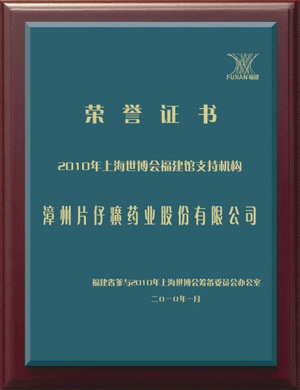 福建館支持機構榮譽證書福建省漳州市唯一一家中華老字號、國有控股上市公司——漳州片仔癀藥業股份有限公司,經過相關部門嚴格篩選,“榮獲2010年上海世博會福建館支持機構”,並將參展,時間安排在8月1日至31日。