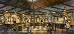 購物廊別致的外觀設計旨在向最著名的迪士尼明星致敬,用馬賽克壁畫的方式呈現著他們所代表的美德:米奇(好客)、米妮與小貓費加洛(關愛)、高飛(樂觀)、唐老鴨(博識)、黛絲(友善)、布魯托和菲菲(慷慨)以及奇奇與蒂蒂(友誼)。甚至連收銀區都有主題——史高治·麥克老鴨的第一家銀行。
