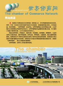 “世界僑商網”是由義烏市僑商會主管、義烏市僑商文化傳媒有限公司投資建設的,專門服務於希望了解僑界訊息,從中尋覓商機的華僑華人,是世界華人僑商的精神家園。該網站立足義烏,面向全球,突出僑商,涵蓋政經,是全球首個以僑商為主體內容的綜合性、公益性入口網站。網站由涉僑資訊、僑商組織、商家名錄、市場商機、投資理財、貿易服務、公益活動等七大板塊構成,提供僑商新聞、涉僑法規、僑界擷英、出國指南、商會加盟等信息服務。網站定位