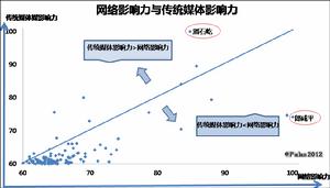 對角線上半部分表示傳統媒體影響力>網路影響力;對角線下半部分反之。越貼近對角線,說明該領袖的傳統媒體影響力與網路影響力差異越小。