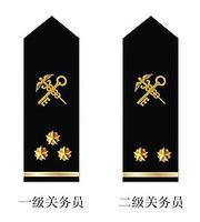 關銜標誌綴釘在肩章上,肩章為劍形,版面為黑色,分為硬肩章和軟肩章。