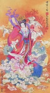 九天玄女,即天后。天命玄鳥,降而生商,為商朝國母。玄女為天后,地位僅次於西王母。傳說玄女任姓,亦稱有任。