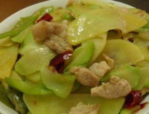 乾煸佛手土豆片是以佛手瓜、土豆、脊肉為原料製作的一道美食。
