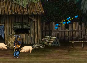 對付特別人物,跳到頭上,向下開槍,他們動不了。(註:對付會跳的很難)對付小兵也行(對付小兵用大刀就行了)。 第3關一衝鋒定要換成AK。打傘兵用手炮、火弓都行,用火箭筒就太浪費了。