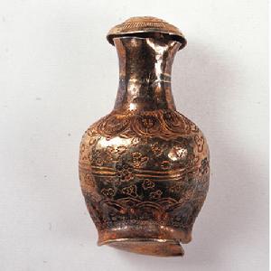 瓶身上覆缽形蓋。 表面鏨刻蓮瓣、花卉等圖案。 瓶內盛貯11顆舍利。