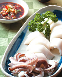 五味醬適量1.軟絲洗淨去除內臟備用。 2.取一鍋放入適量的水,再放入蔥段、薑片煮沸後,放入作法1的軟絲,轉小火煮煮約3分鐘,熄火再燜約2分鐘,取出待涼切片,盛入盤中備用。 3.將五味醬淋於作法2的軟絲上即可。