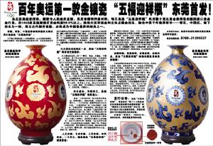 奧運“五福迎祥瓶”瓶身超過50%的“描鑲金”和“立體點鑲金”,因成品率不到8%,每隻耗金量都要高達數十克;為了燒造出純正的中國紅,特地採用稀有而貴重過黃金的金屬鉭。如此不計成本,在中華千年“金鑲瓷”史上極其罕見!