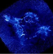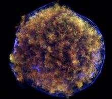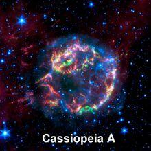 325年前超新星爆發殘骸照片美國宇航局通過多種空間望遠鏡對325年前發生的超新星爆炸殘骸進行了拍攝,併合成了最新的全彩圖像,將有助於科學家進一步研究分析超新星爆炸過程。 圖中藍色部分是由錢德拉X射線天文台通過X射線波段拍攝獲得的;綠色部分是由錢德拉X射線天文台匹配X射線居間能量拍攝的;黃色部分是由哈勃空間望遠鏡通過900納米波長濾波器拍攝的;紅色部分是斯皮策空間望遠鏡通過24微米探測器拍攝的。